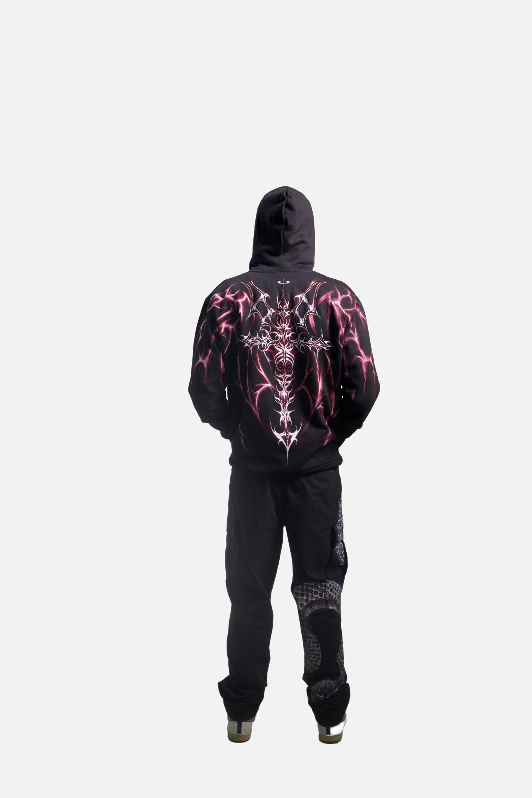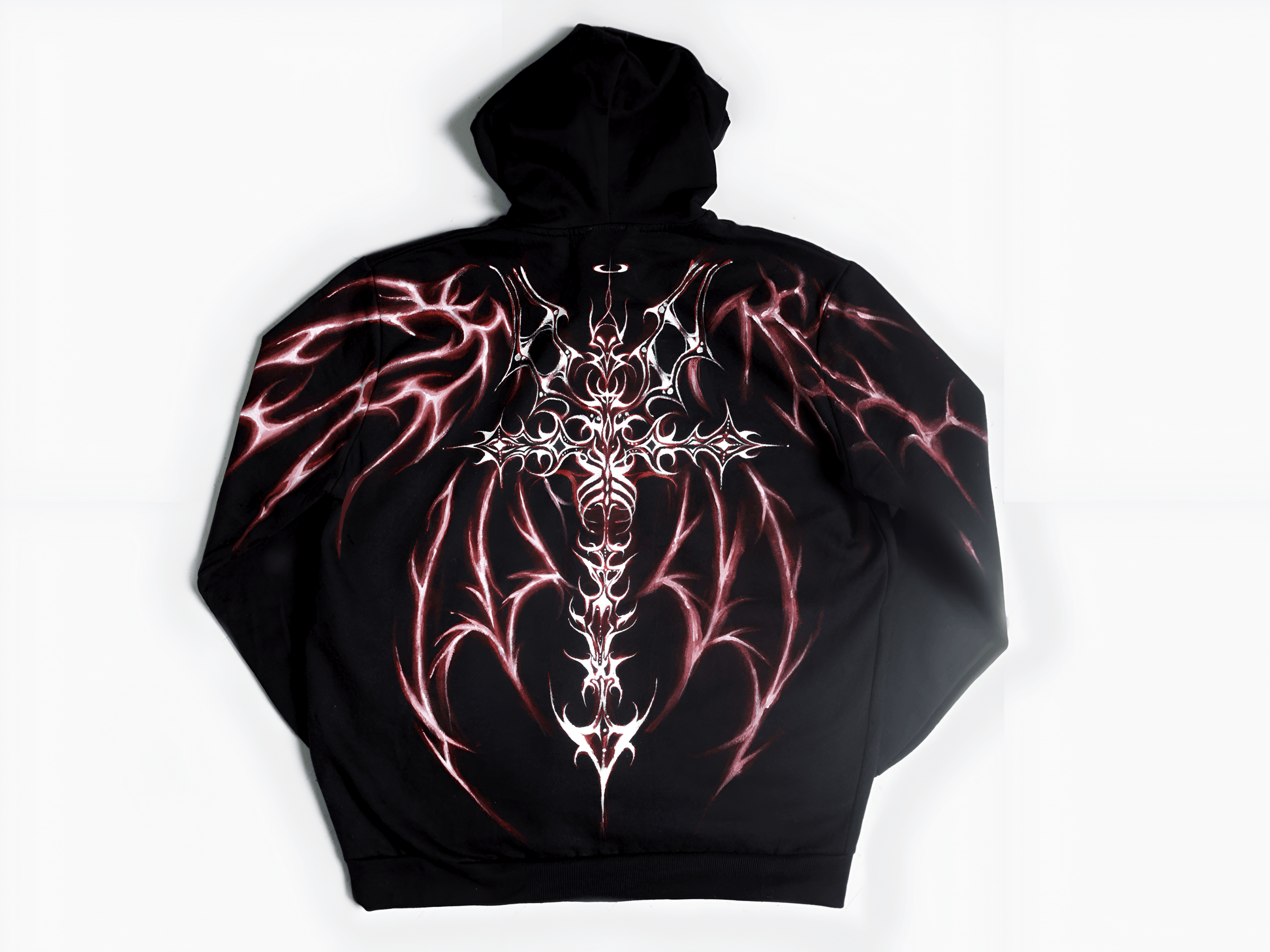 A hand painted textile artwork covers the full back and shoulders. The design represents death and rebellion. The wings resemble those of a weeping angel stripped of feathers. The imagery feels broken and aggressive. White shapes create contrast. Bloody red cuts through the artwork. A light touch of pink adds tension without softening the message. Each hoodie stands alone. No two pieces match.