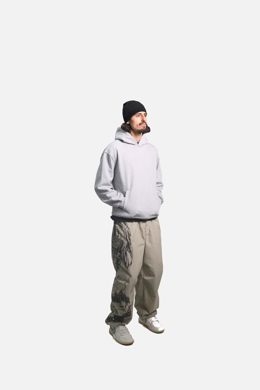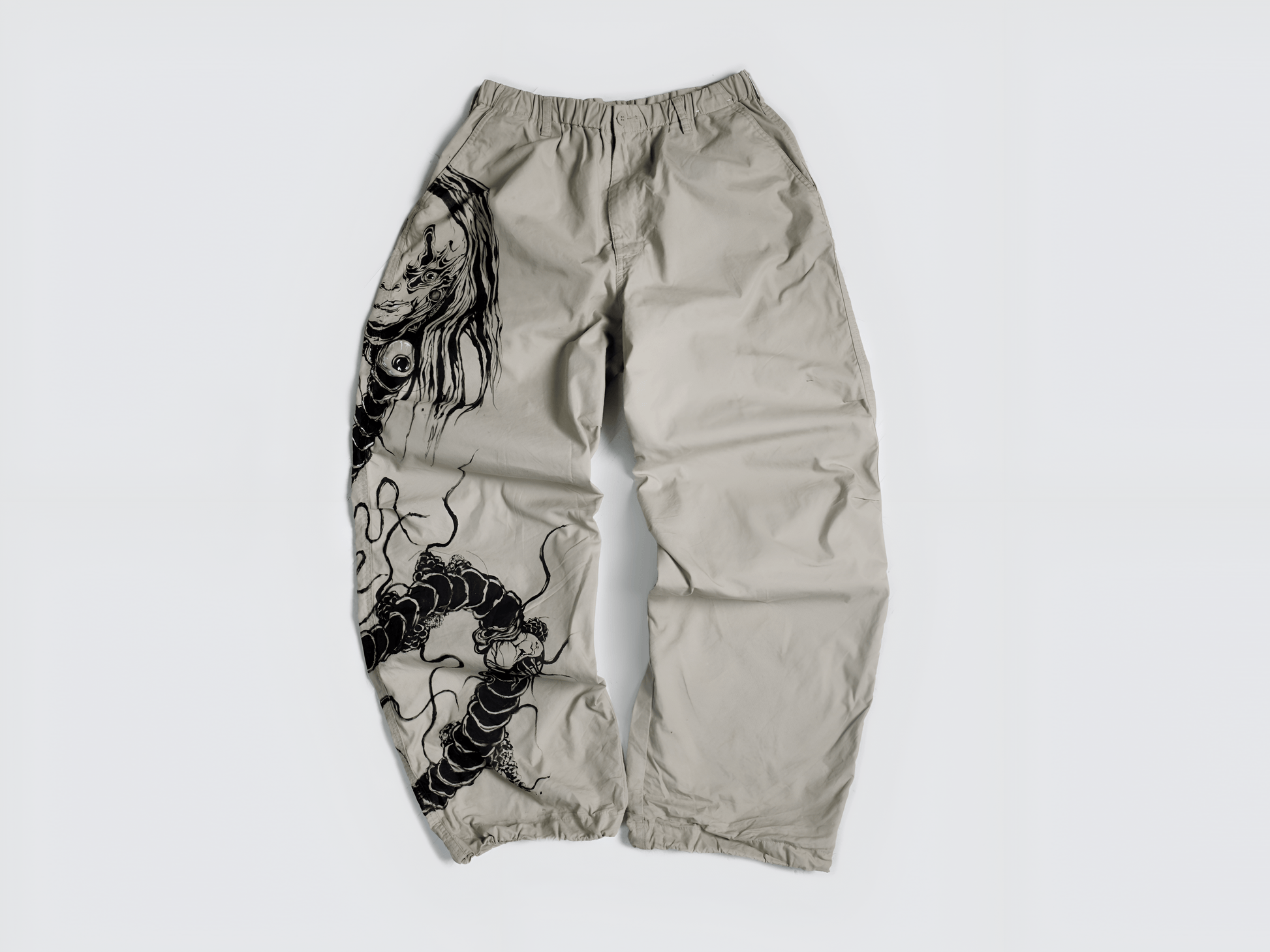 A hand painted textile artwork appears on one side of the pants. The artwork carries a spiritual symbol. The design feels alive, slightly unsettling, as if the garment carries motion within the fabric. Each piece differs. Your pair never matches another. The artwork evolves as you wear the pants over time.